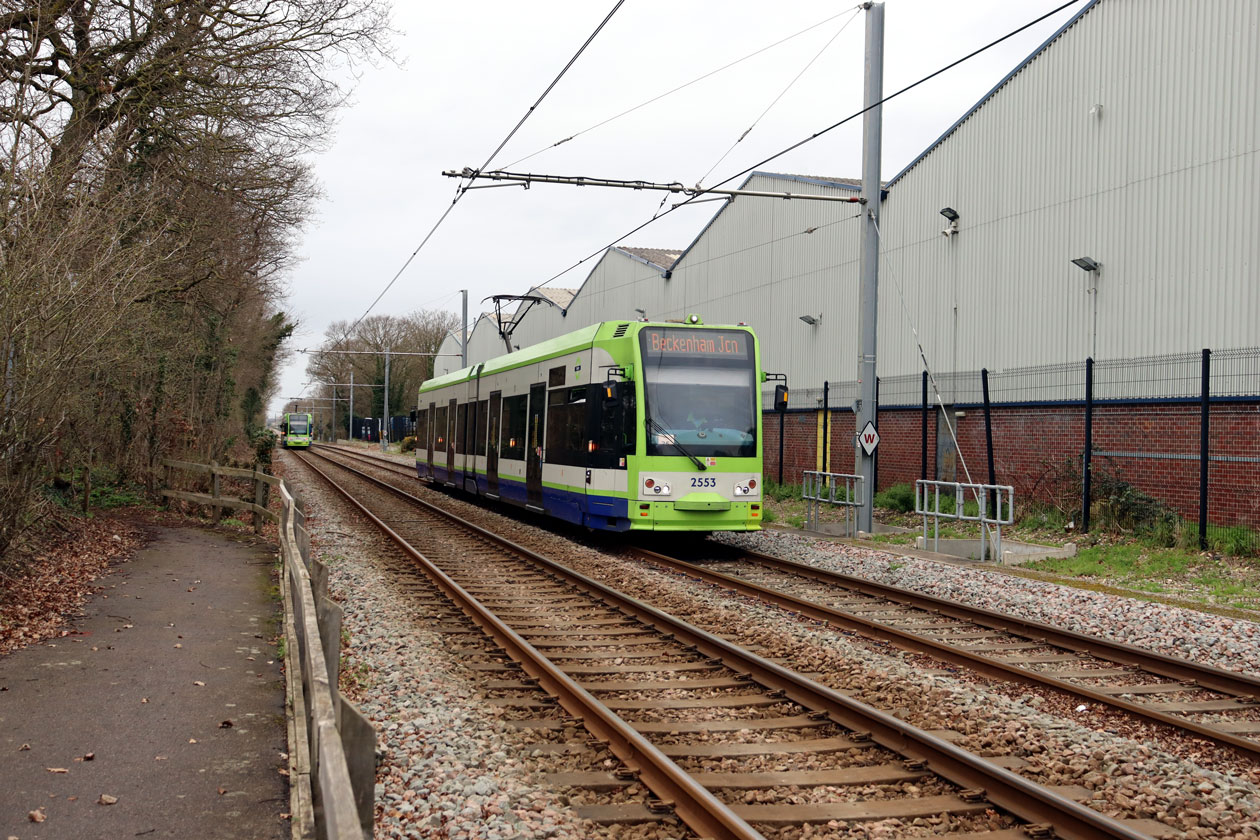 15 years later on 29th March 2023 and 2553 is now in the newer fleet livery of green, white and blue. Still with electric destination displays the tram is approaching Beddington Lane with a service running from Wimbledon to Beckenham Junction. (Both Photographs by Gareth Prior)