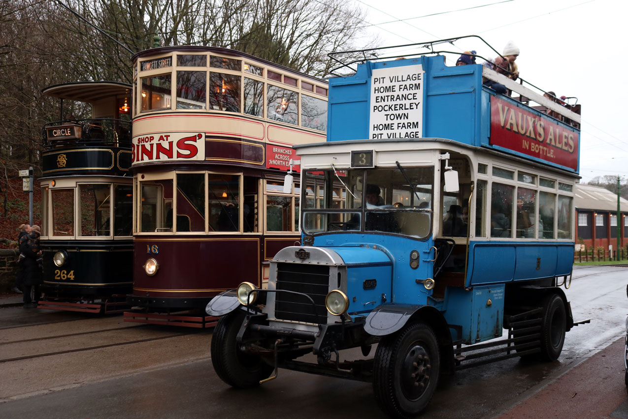 An early 2024 view – 2nd January 2024 to be exact – at Beamish with an as expected two tram output of Sheffield 264 and Sunderland 16, with the January weather not exactly suggesting any other tram may be in use! The pair cross at Foulbridge with the replica B type bus for company.