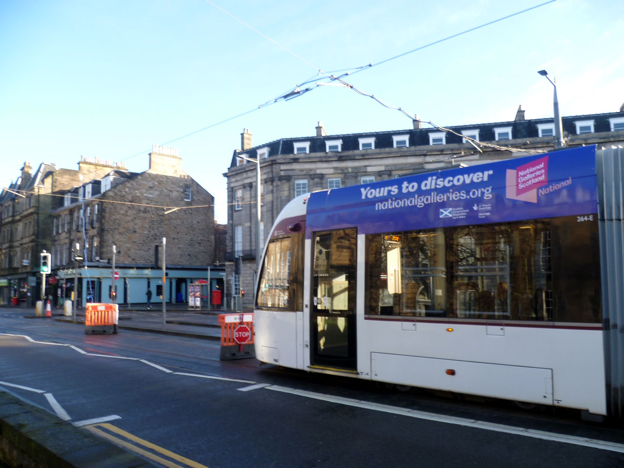 264 is now at the stop and waits for departure. The stop boards which prevent it from going any further are seen in front of the tram.