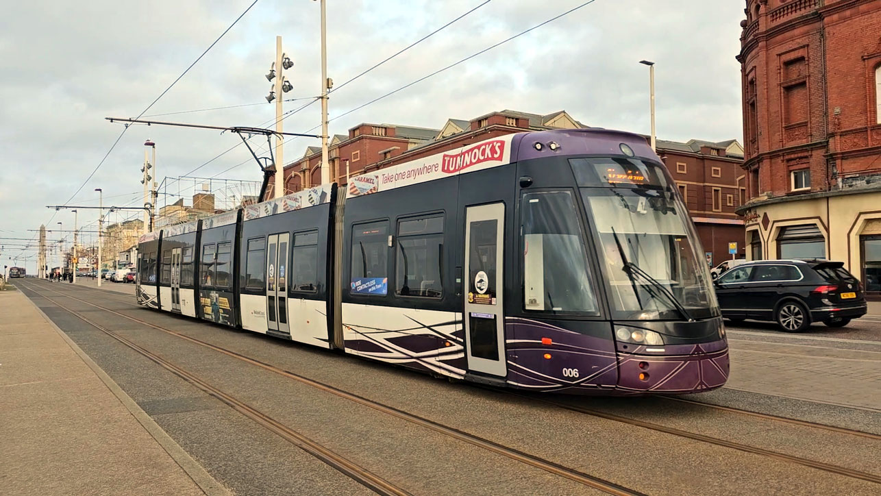 This is the end of 006 which has had the cameras fitted as it is seen having just left North Pier for Starr Gate. (Photograph by Michael Morton, 27th January 2024)