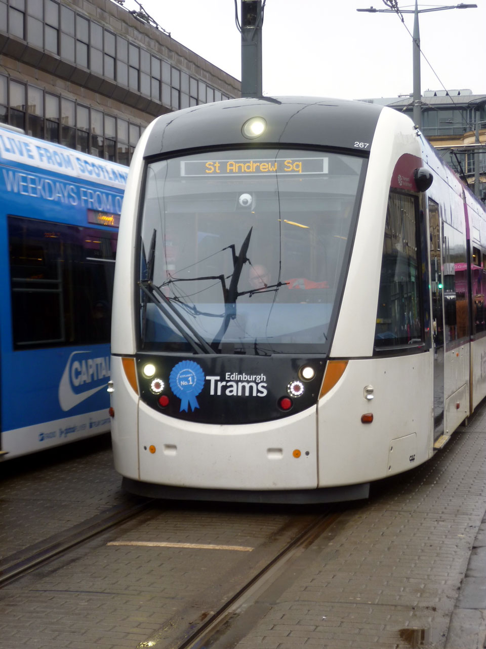 A number of services from the Airport only went as far as St Andrew Square before using the crossover at York Place and returning to pick up more rugby crowds. 267 demonstrates the St Andrew Square destination at Haymarket; 262 is alongside.