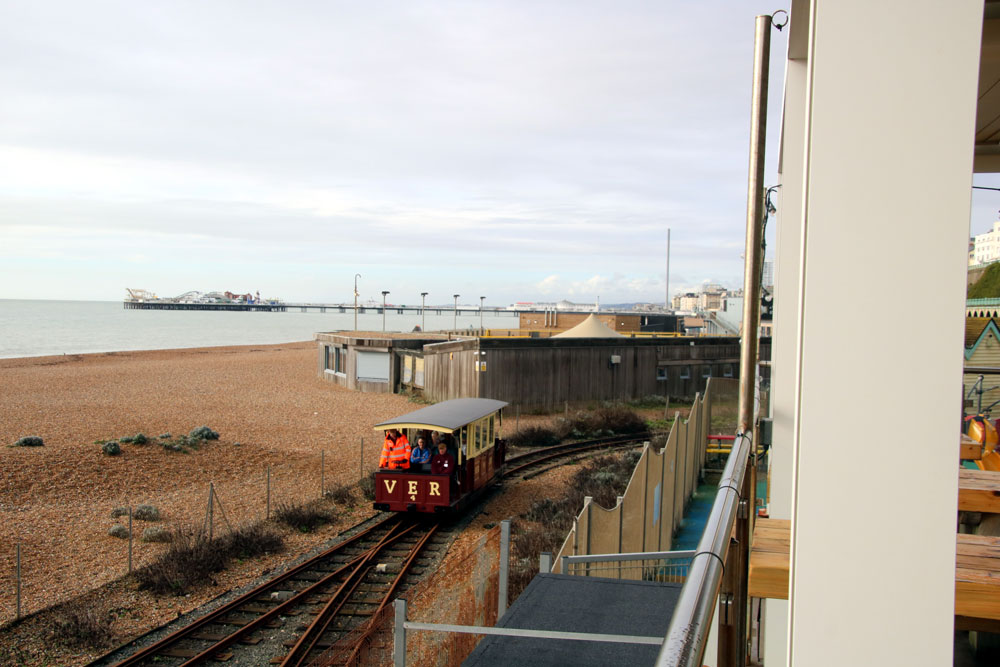 The Volk’s Electric Railway in Brighton was triumphant at the recent Heritage Railway Awards where it was named the Railway of the Year and with the ceremony taking place in Brighton there was the rare sight of a public service being operated on the line. On 10th February 2024 this photo shows 4 as it rounds the bend into Halfway/Peter Pans Playground with a Black Rock bound service. The Palace Pier can be seen in the background. (Photograph by Tony Sullivan)