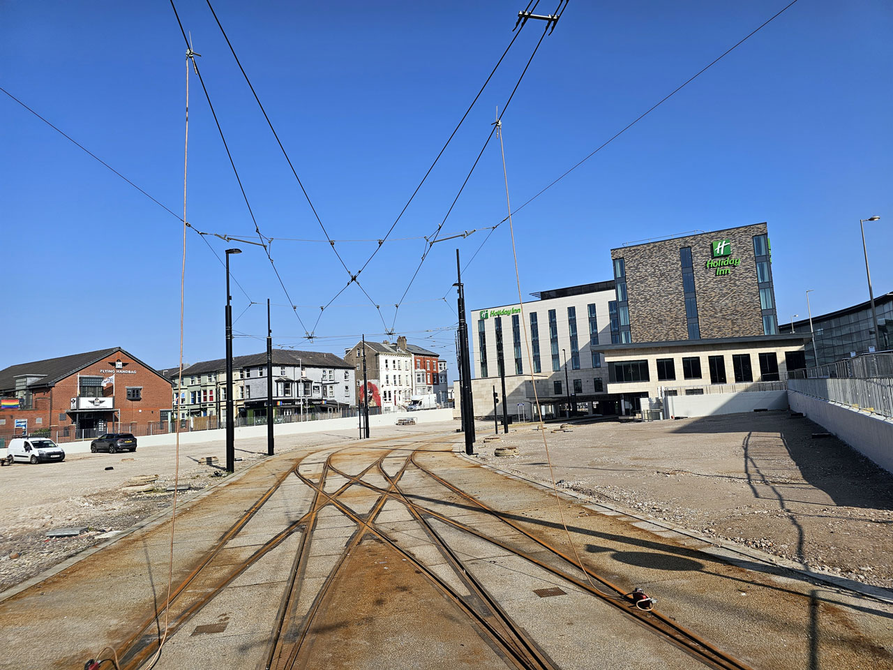 From the entrance to the site (the doors of Wilko’s if you like!) we look towards the hotel and tram terminus here. The overhead needs sorting again but apart from that most of the tramway work has been completed.