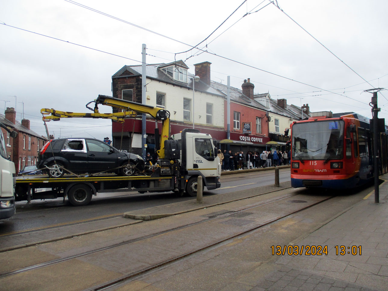 One of the cars involved in the collision has been lifted onto a lorry now and is being removed from the scene. Meanwhile, waits at the stop having had to terminate with a Blue route service.