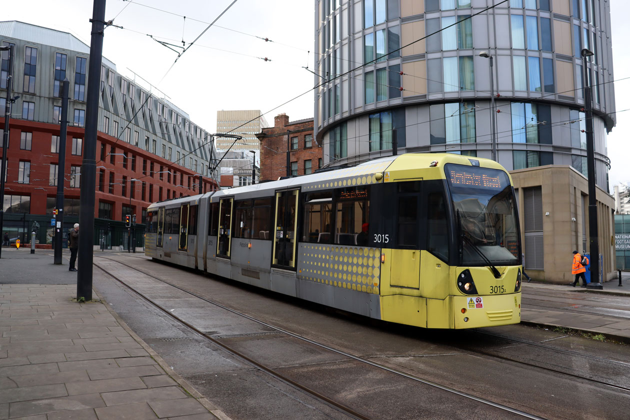3015 arrives at Victoria. Its about to terminate before heading off back out to Manchester Airport (its difficult to tell from this photo but the destination display has already changed for its return journey). Its on the 1CC tracks here with the 2CC tracks the other side of the tram remain closed to all trams. (Photograph by Gareth Prior, 19th March 2024)