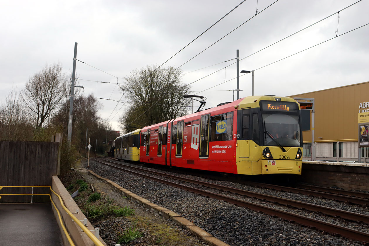 3069 leads 3127 into Abraham Moss with a service from Bury to Piccadilly. The new advert on 3069 is seen here showing the bright red colour used which will surely at the very least make it is easily visible to the public! (Photograph by Gareth Prior, 20th March 2024)