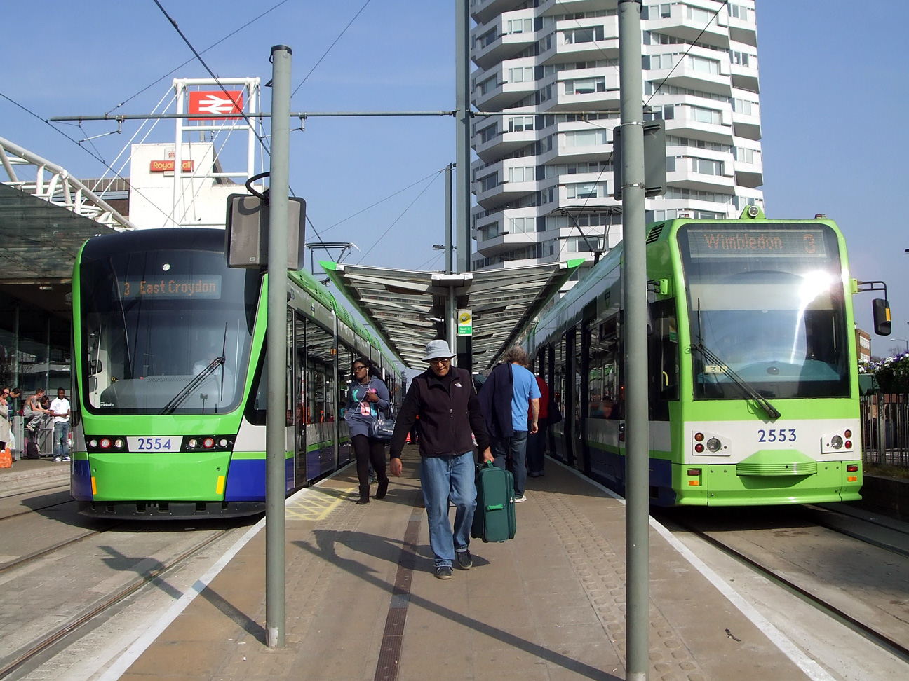 On its first day in passenger service – and with lovely sunshine too! – 2554 is seen on the central platform at East Croydon before it heads back westwards on 30th March 2012. As luck would have it the last of the original Bombardier trams is alongside with 2553 heading to Wimbledon. (Photo: Michael Steward)