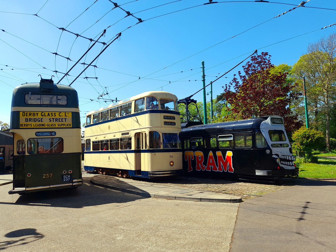 Sheffield 513 arrives back at Chapel Road on 5th May 2024. Of course, Blackpool 634 waits for it at the terminus for its turn to run into the woods. The rear of Derby trolleybus 237 is on the left.