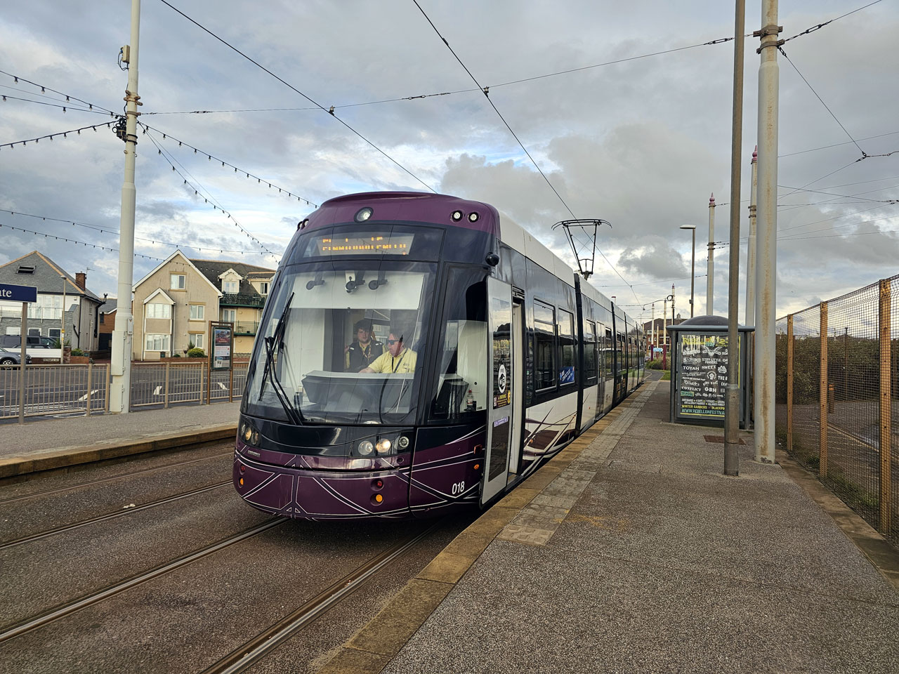 018 gets ready for the off from Starr Gate with a service to Fleetwood Ferry. The ODAS cameras are seen at the top of the cab windscreen. (Photograph by Michael Morton, 26th May 2024)