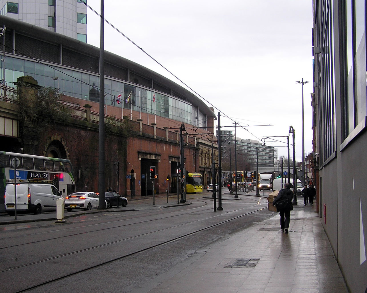 The now brings us up-to-date and shows a tram emerging from the undercroft and about to cross London Street. We can now see the two portal entrances to each platform with track now in the foreground running alongside London Road. Also of note is major work on Piccadilly Station itself which is above the undercroft and more development has taken place on the right. (Both Photographs by Keith Chadbourne)