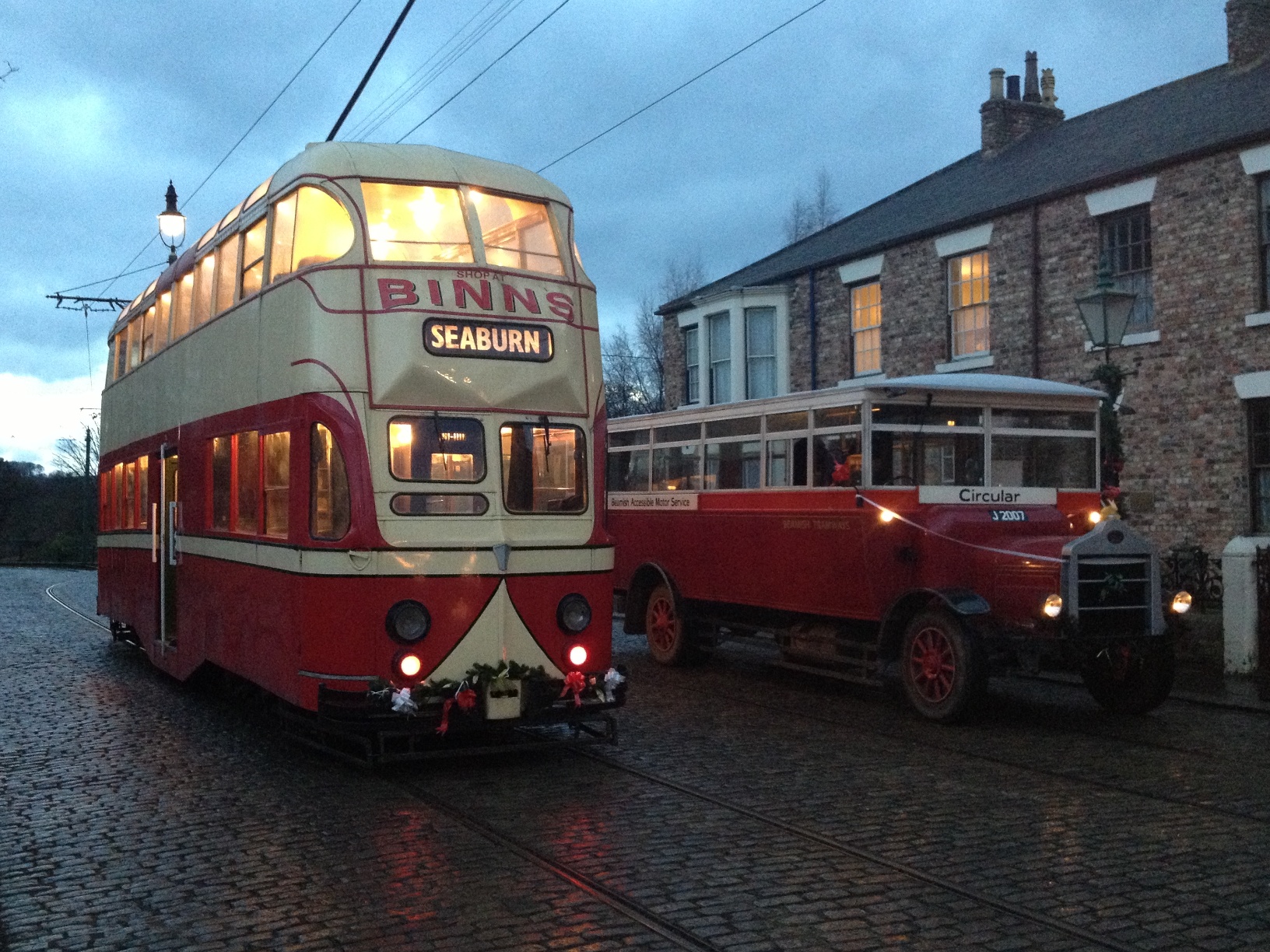 Sunderland 101 (AKA Blackpool 703) shows off its tasteful decorations in the town at Beamish at the end of another day in service. (Photo from the Beamish Transport & Industry Blog)