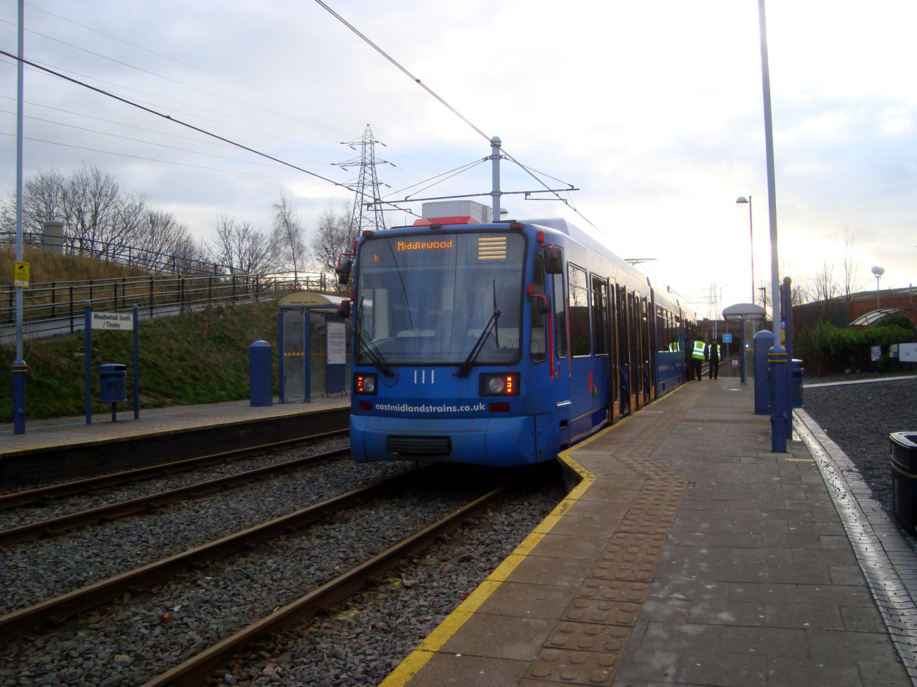 111 waits at Meadowhall South ahead of departure to Middlewood in the wrong platform. Note that 111 has now had the new air conditioning units fitted.