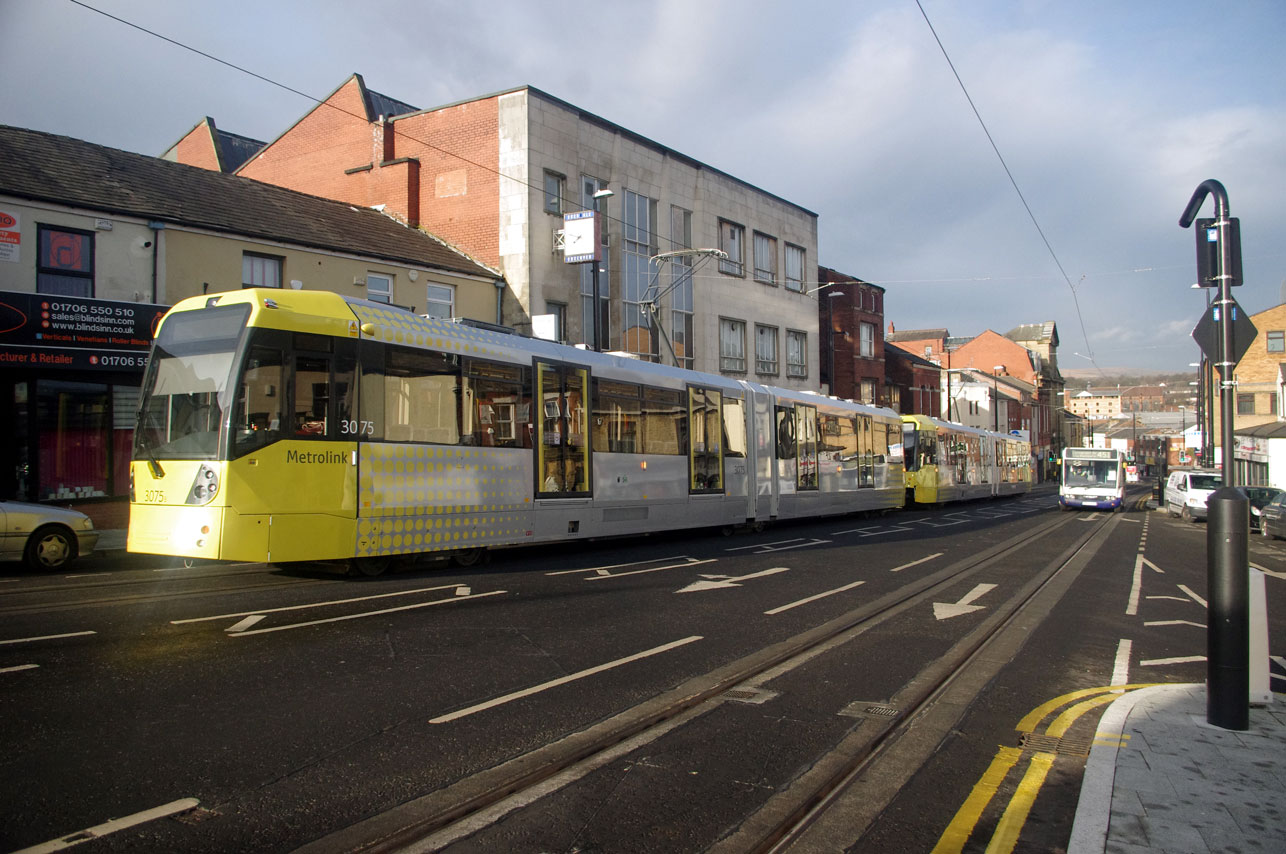 3075 and 3076 in Rochdale town centre during testing on 21st January. (Photo: Harold Hull)