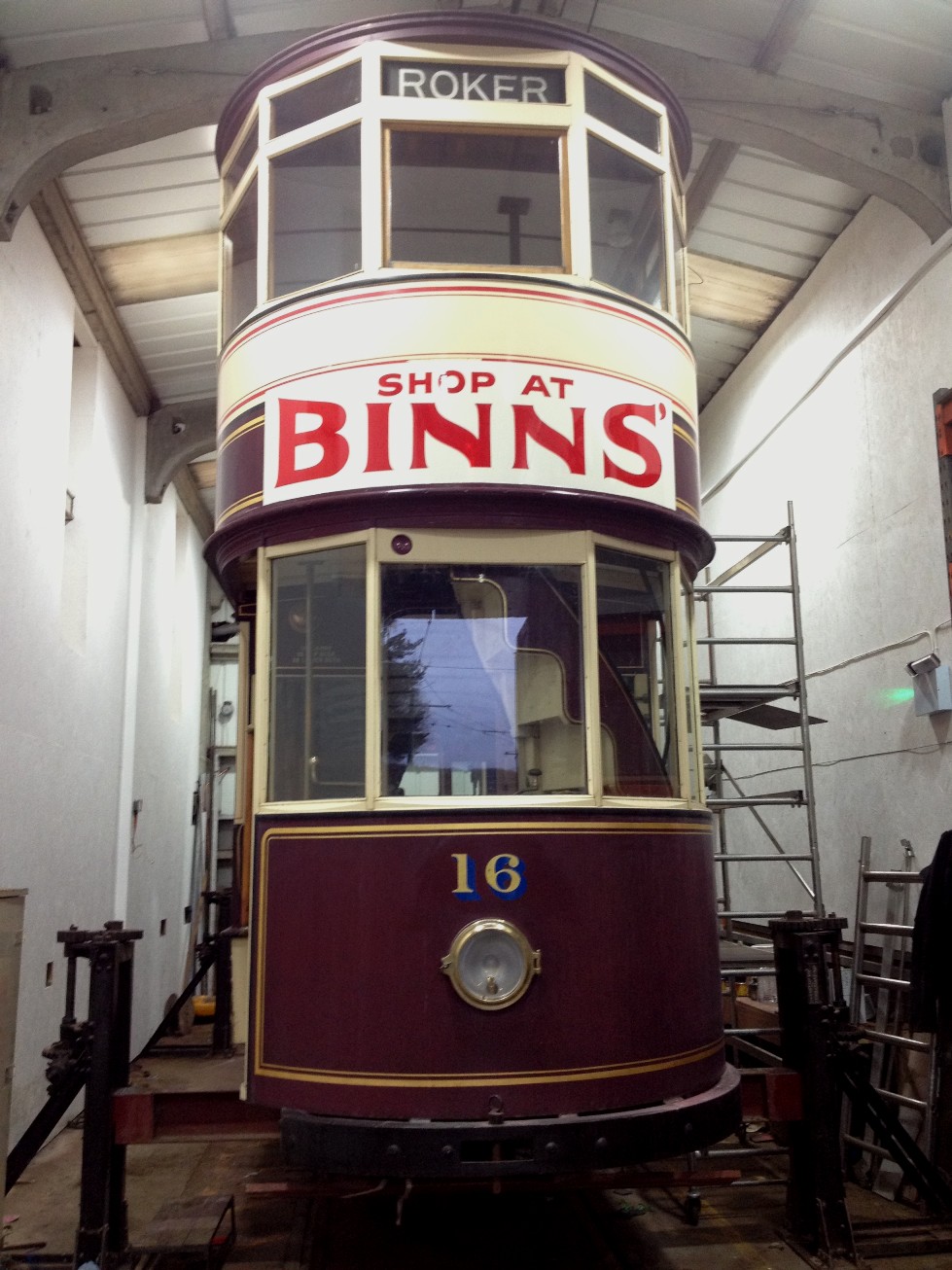 A sneak preview of Sunderland 16’s newly painted adverts, seen in the tram depot at Beamish where the tram is residing whilst its truck is under attention. (Photo courtesy of the Beamish Transport & Industry Blog)