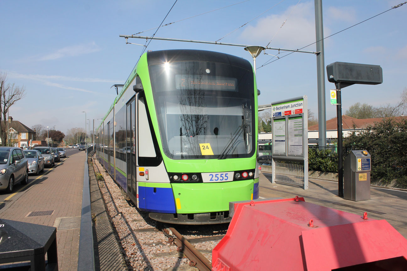 2555 stands at Beckenham Junction on a sunny 1st April. Note that the tram is using the road side platform rather the station side platform as is now the norm.
