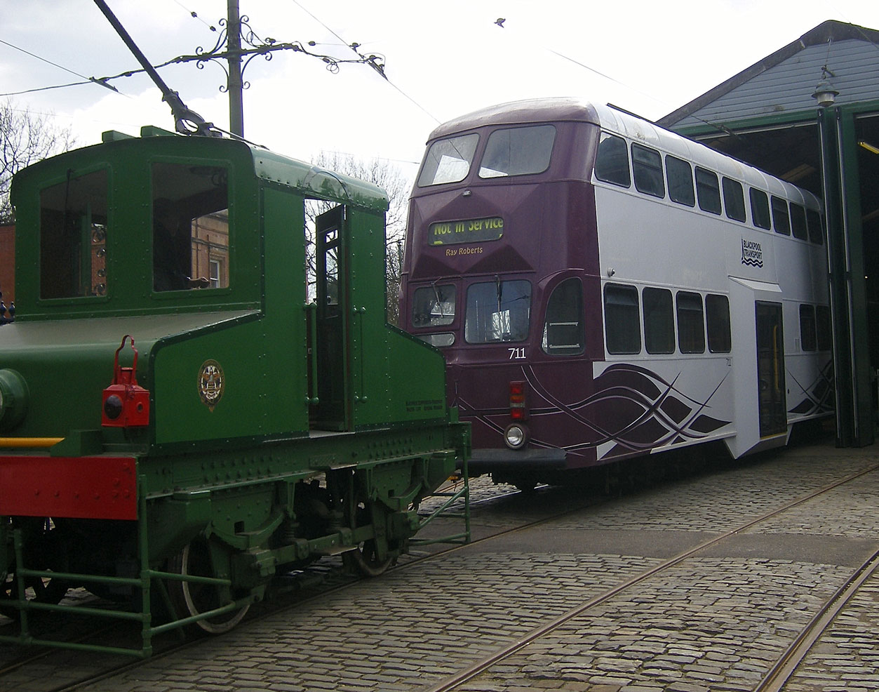 The Blackpool Electric Loco pushes fellow Blackpool car 711 into the Workshop.