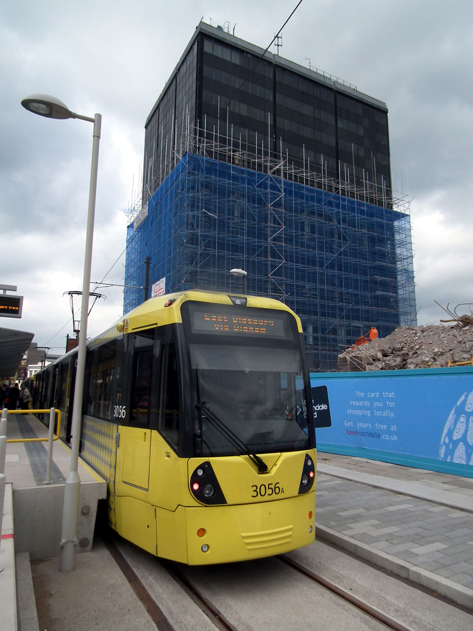 3056 stands in the platform at the Metrolink terminus with the ongoing demolition work in the background.