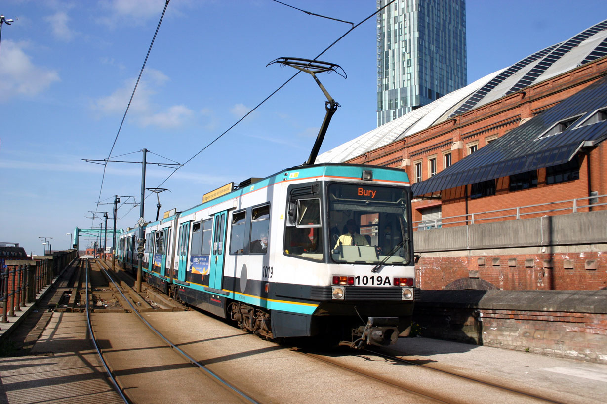 1019 is seen here in happier times when operating as part of a double unit with 1018. They are seen leaving the viaduct at G-Mex on 3rd May 2011. (Photo: Gareth Prior)