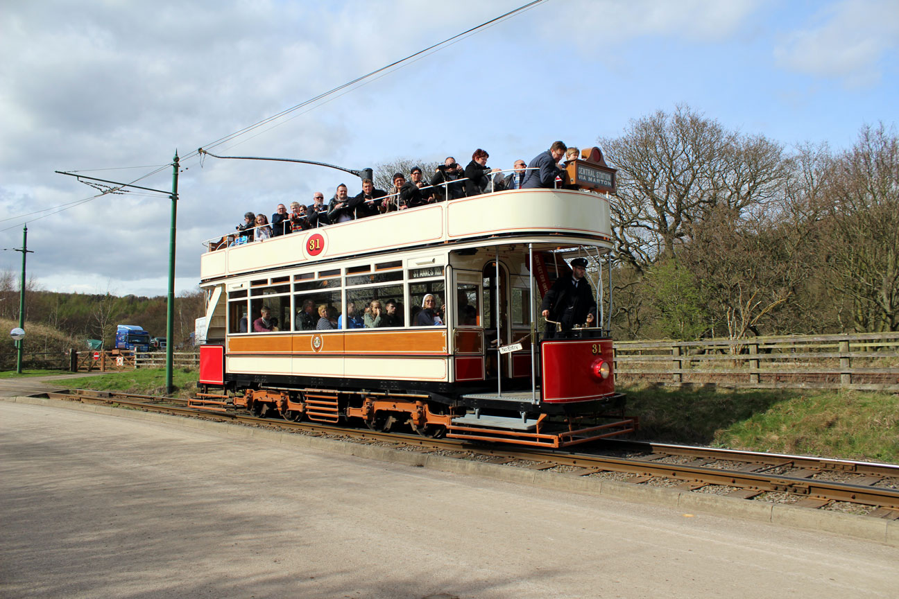 Blackpool “Marton Box 31” does what it does best, carrying full loads at Beamish. It is seen having just left the town on 11th April 2014. (Photo: Gareth Prior)
