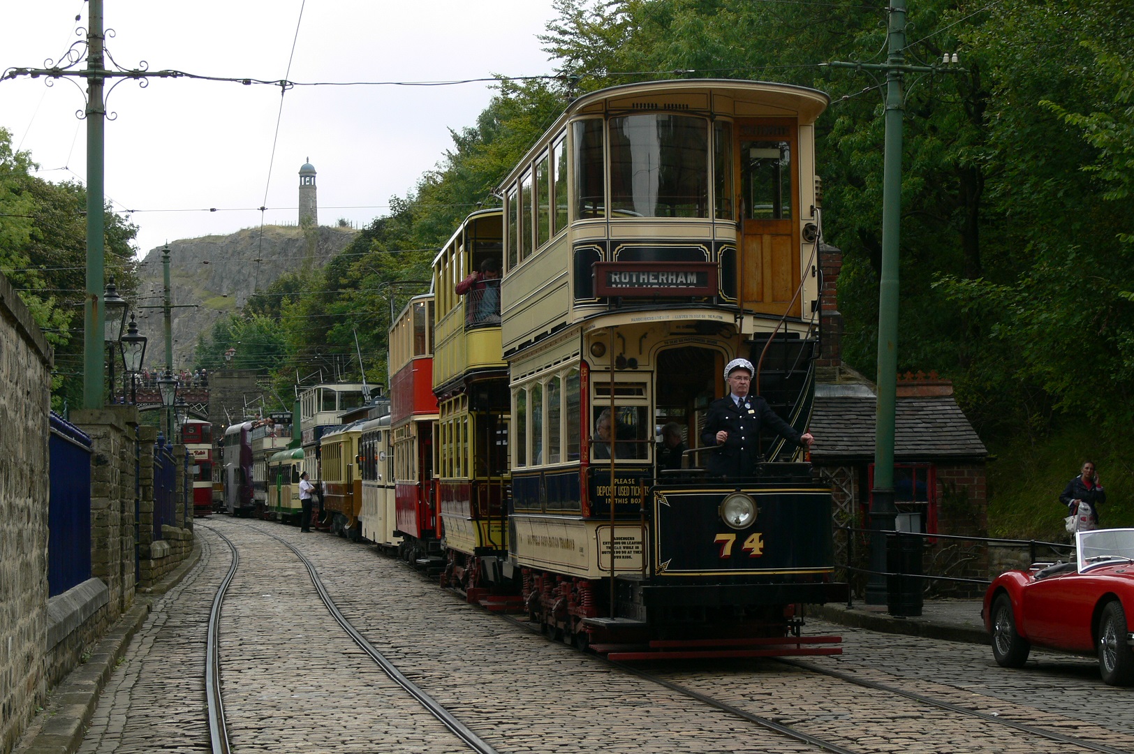 Part of the Saturday cavalcade is seen in the street with Sheffield 74 heading a line of trams which entered service at the museum within the last twenty years.