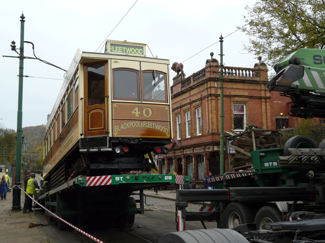 The extent of the slope on the trailer used to transport Box car 40 to Blackpool is shown to full effect as the tram waits to bid farewell to the museum in the shadow of the Red Lion.
