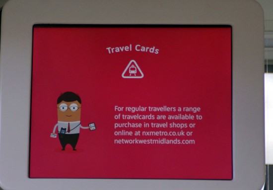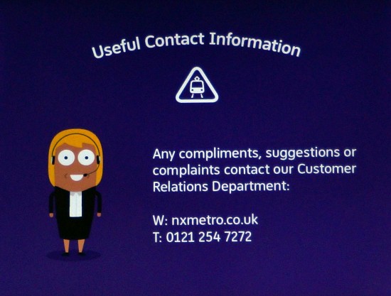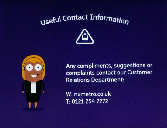 The information screens on Midland Metro’s new Urbos 3 trams have now started to work with a number of different cartoons giving important information to passengers. Yes it isn’t the most groundbreaking news we have ever reported but we quite like this cartoons and with thanks to Andy Walters are able to bring you images of these.
