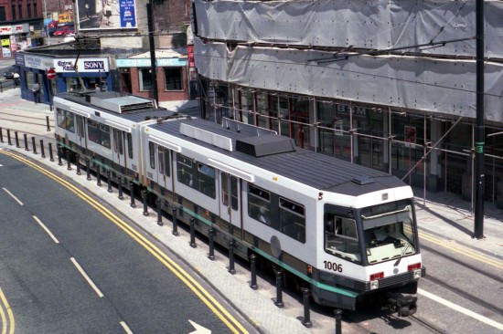 Our image shows 1006 on 12th June 1992 running a Bury direct service (shortly before operations were extended between G-Mex and Altrincham) along High Street as it approaches the site which would become Shudehill Interchange.