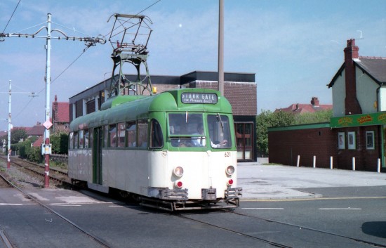 Although many of you reading this will mainly remember 621 for its all over adverts – it last carried the green and cream in mid 1995 – our photo today features the tram carrying fleet livery. It is seen here approaching Cleveleys with a service for Starr Gate on 31st August 1993.