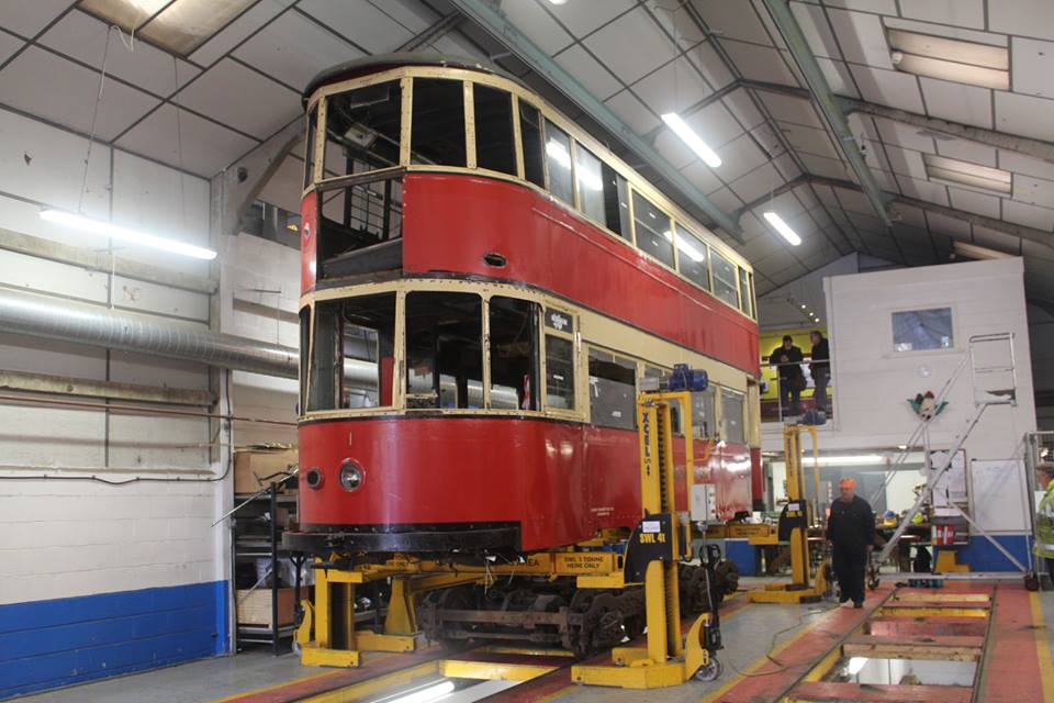 As we reported recently, Liverpool 869‘s bogies have been fully re-assembled following the delivery of its new axles, and this has now allowed the car to be reunited with its bogies. On 2nd May, 869 was moved onto the depot track fan to allow Glasgow 22 and London Transport 1 to be shunted. The latter was then transferred onto track 2 in the workshop, where it was separated from its own bogies. This was quite an historic occasion, as it is thought to be the first time this tram has been lifted since it entered preservation, as until now it has only received paintwork attention. The car was then mounted on a temporary accommodation truck, allowing it to be returned to its more familiar spot at the rear of track 3, with its own bogies then being placed in front to await further examination. Liverpool 869 was then moved to the front of the same track where it will presumably receive further preparations ahead of an expected return to service later in the year.