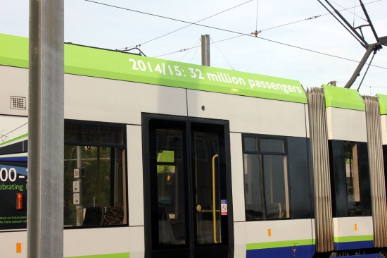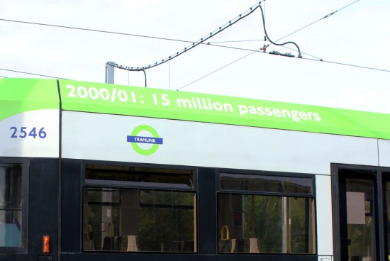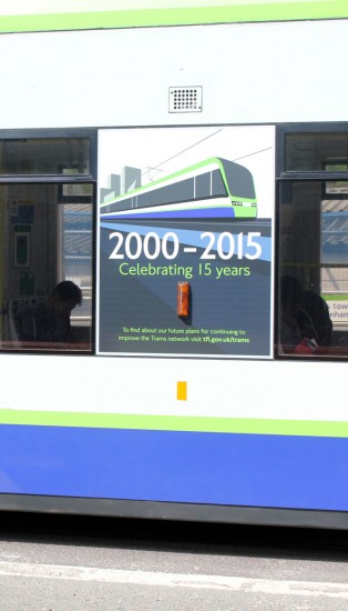 London Tramlink is 15 years old. The first line – from New Addington to central Croydon – was officially opened on Wednesday 10th May 2000 and over the past 15 years the network has gone from strength to strength with 32 million passengers now carried each year. To celebrate the 15th anniversary CR4000 2546 has been adorned with a few vinyls showing how passenger numbers have grown since inception (and where they are estimated to be in another 15 years) and also a 15th anniversary logo. Still in the standard fleet livery of Lime Green, Blue and White the tram is now in service on the network commemorating the anniversary.