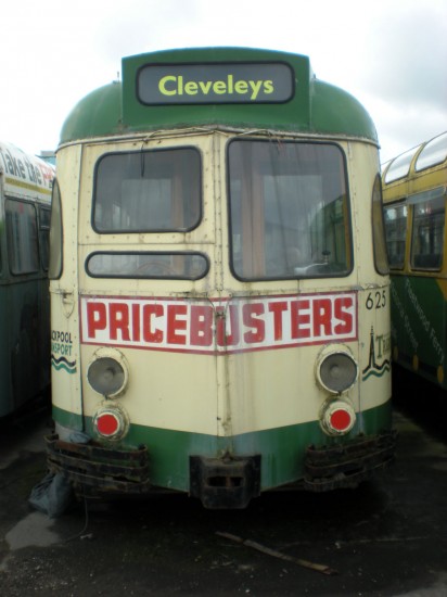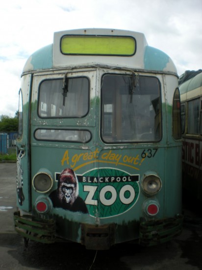 The four trams were moved from Blackpool to open storage in Knowsley between December 2011 and February 2012 and since that time have been stored in the open. The two Trailers are in effect orphans with 681’s towing car now back at Rigby Road but not currently intended as a restoration project with 687’s mate having been scrapped during the restoration of the illuminated Western Train. It had been intended that as part of the Wirral Waters project these two trams would be rebuilt for use on the extended tramway. The two Brush Cars – 625 and 637 – have not operated for many years with the former retaining green and cream fleet livery and 637 in a pleasing all over advert for Blackpool Zoo. They too were also expected to be rebuilt as part of the project.
