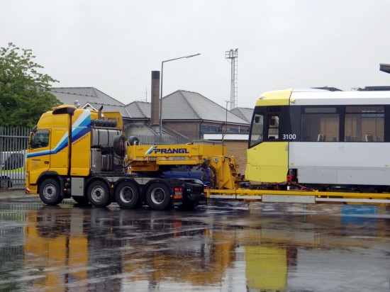To mark the occasion of the delivery the Transport for Greater Manchester Twitter feed was plotting the progress of the trams has it made its way from Vienna to Manchester and so we can now see the exact route the deliveries take! Leaving Vienna on Tuesday 9th June the tram was transported via Koblenz and Goch (both in Germany) before heading to Rotterdam for the ferry to Hull. Docking in Hull early on Saturday 3100 was then transported across England before arriving at Queens Road Depot in Manchester at around 1200 on Saturday 14th June.