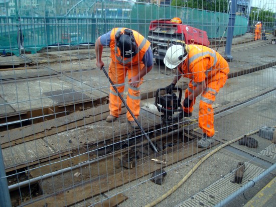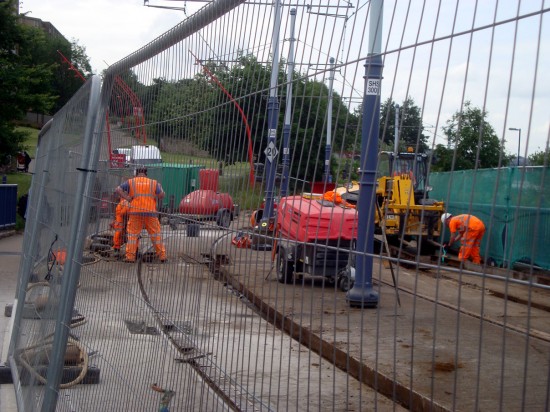The latest phase of rail replacement works on Stagecoach Supertram have now commenced with the first stage of these works being on South Street Bridge between the delta junction and Sheffield Station. As a result of these works trams on the Blue route from Malin Bridge are being diverted to run onto the Yellow route as far as Cricket Inn Road with the trams then running into the depot to reverse. These works are due to continue until the end of this week after which time Blue route trams will run through to Sheffield Station which will act as the terminus until the end of August. Photos showing the work which has been undertaken this week so far are provided by Stuart Cooke.
