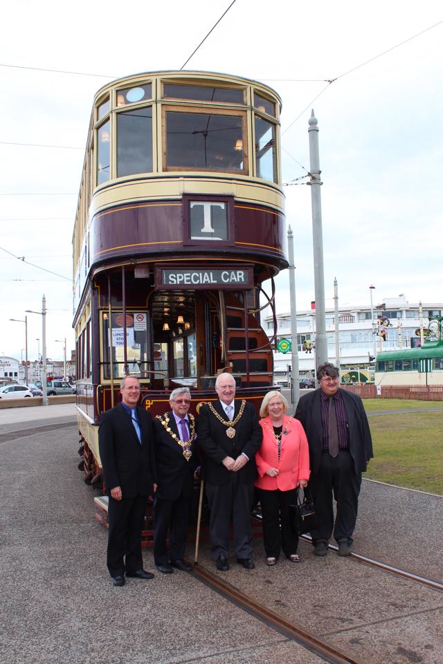 Some of the private party who rode on Bolton 66 - including both Mayors - pose with the tram at Pleasure Beach on 31st May. (Photo by Shaun Whitehead)