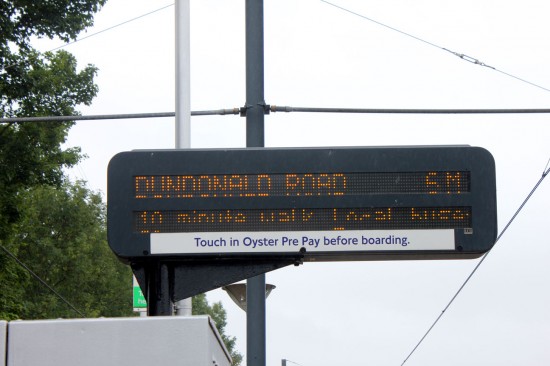 The Passenger Information Displays are showing passengers the destination of the tram and also let them know it is only a 10 minute walk to Wimbledon.