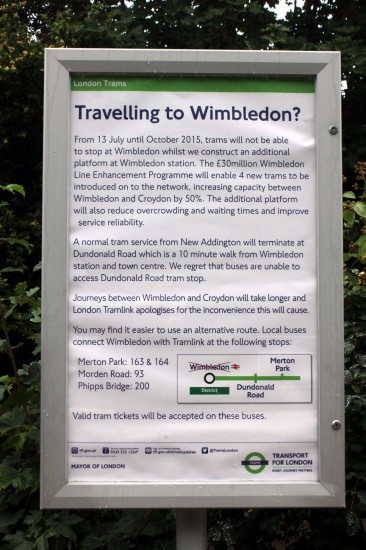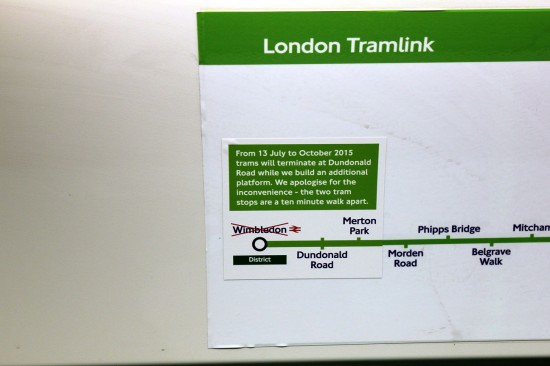 As we have reported previously all London Tramlink services on the Wimbledon branch have been terminating short at Dundonald Road from 13th July and will continue to do so until October. This is because of the works at Wimbledon to construct a second platform and the associated trackwork required to allow trams to access both platforms. During the works passengers are being advised that they can either make the short 10 minute walk between Dundonald Road and Wimbledon or alternatively change onto service buses at Merton Park, Morden Road or Phipps Bridge. It seems at this stage that most passengers are happy to make the 10 minute walk to continue their journeys.