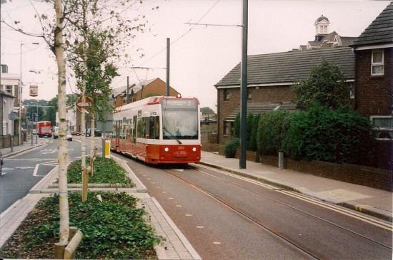 This photo shows Bombardier Flexity CR4000 2552 on a test run rolling along Tamworth Road on 8th October 1999. To the left of the photo the shopping centre called