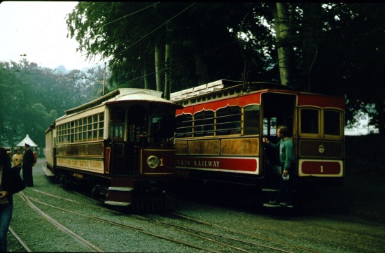 This photograph was taken on 26th August 1980 and shows the Manx Electric Railway’s 1 and an unidentified trailer pausing with a service running through to Laxey. At the time of this photo 1 had only been back in service for a year following an overhaul and was carrying the Maroon and Cream livery of the Douglas and Laxey Coast Electric Railway – a similar livery to that it carried when the line originally opened. Alongside is Snaefell Mountain Railway 1 which is making preparations for a trip up to the Summit. As can be seen the SMR’s no. 1 was carrying the standard livery as seen on the majority of the fleet today, although not this car as it looks resplendent in its Blue and White colours.