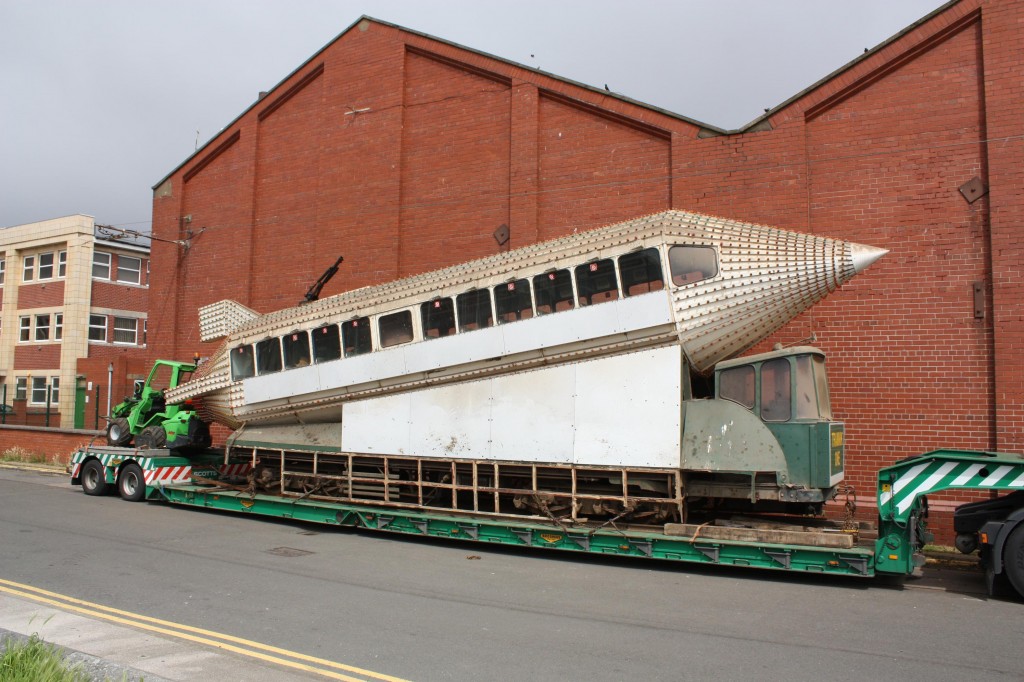 The Rocket 732 is seen emerging from the confines of Rigby Road for one last time on July 9th. Only the tow bar and lack of trolley arm indicate that the car is not setting off for another promenade voyage! (Photo by Andrew Blood)