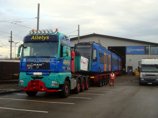 At 2140 on Monday 30th November a little piece of history was made when the very first tram train arrived at its new home following a lengthy journey from Spain. The Vossloh built vehicle arrived on the back of a Allelys low loader in the dark and was driven into the confines of Nunnery Square Depot and spent its first night in South Yorkshire awaiting unloading.