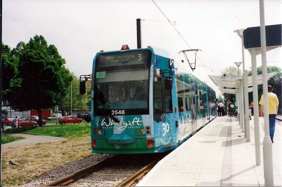 2546 arrived at Therapia Lane on Monday 22nd March 1999 (at this time the Bombardier built trams were arriving at the rate of one a week) and at this time it was completed in the original fleet livery of Red and White but by the time the system opened it has receiving a vinyl wrap livery for Whitgift Shopping Centre (actually applied in November 1999 during the testing period). It is in that livery that we find the tram at New Addington on 10th May 2000 which was the very first day passenger services were operating on Tramlink. At this time the service pattern was different to that we know today with trams from New Addington running round the central Croydon loop rather than to Wimbledon.