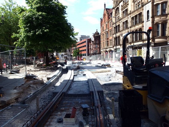 This image shows the view looking from Albert Square down towards Cross Street with both track and road surface in place.