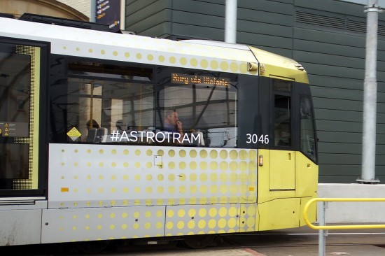 The past week has seen a number of trams on Manchester Metrolink transformed into Astrotrams as part of the City of Science Festival. Externally the trams don’t look very different with just small window vinyls saying #astrotram but internally it is a different story! The ceilings of the trams have been filled with astronomy facts and interactive triggers and customers who download the free SciMan app can play augmented reality videos, bringing science to life. Passengers at stops have also been treated to intergalactic facts from Professor Brian Cox.