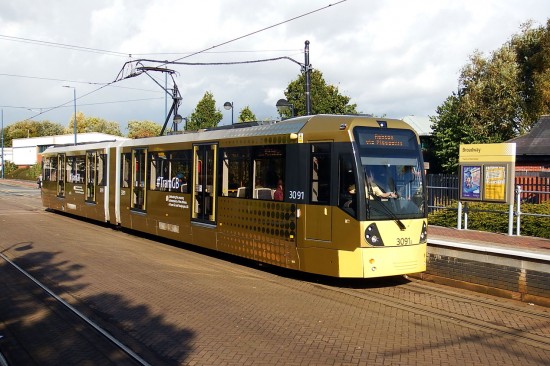 Manchester Metrolink M5000 3091 has gone gold in celebration of Team GB’s golden summer at the 2016 Rio Olympic and Paralympic Games. The tram has received a special vinyl wrap livery – mainly avoiding the windows – as part of a day of celebration in Manchester which has culminated in a Heroes Parade through the city. 3091 has been chosen specifically for the livery as that is the total number of gold medals won by both Team GB and Paralympics GB during the summer.