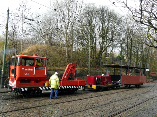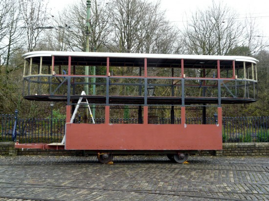 The roof section of Bluebird was not built to a stable structure in its own right and during the process of reassembly temporary support had been incorporated to give it some stability. The roof had been kept on a specially constructed platform ever since it was split from the body and it was on this platform that the roof was hauled to the Bandstand with the Croydon Tramlink KLV and diesel locomotive GMJ on hand to assist.