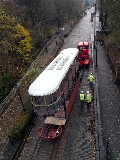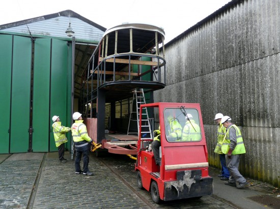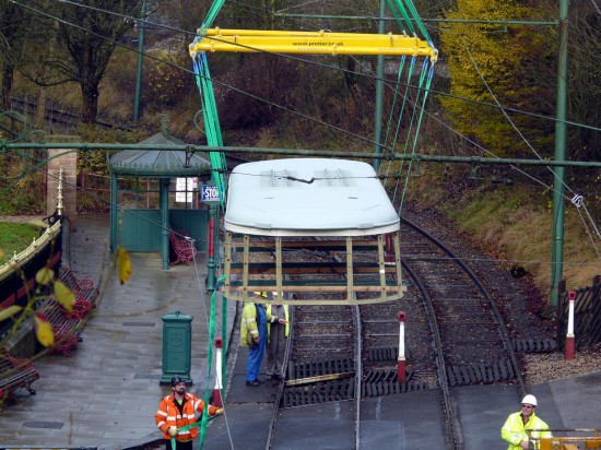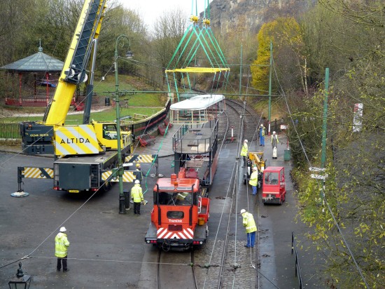 The procedure saw a system of spreaders, designed to support the load evenly, attached and the complete roof assembly was lifted carefully from the platform by the crane. The main body of the tram had also been moved onto the mainline and the roof was lowered and aligned to the body before the two sections were once again joined together to form a complete tram.