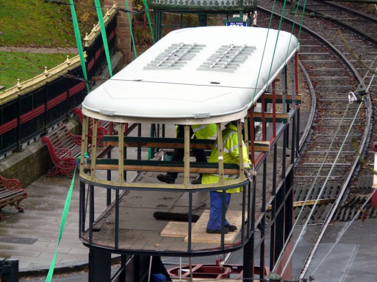 Since the two sections were split a significant amount of work has been undertaken on both structures although there remains a lot of attention before Bluebird will once take flight. Recently the roof has been painted and treated and with this work completed on 23rd November it was time for the roof to be joined back to the tram body. A mobile crane was hired and after the realignment of the overhead wires on the mainline at the Bandstand the procedure to bring the two parts together could begin. The overhead power had been switched off and the overhead wires were also earthed to the running line before the maneouvre could take place.