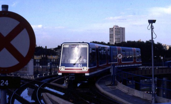 This photo shows no. 04 one of 11 P86 stock trains built by Linke Hofmann Busch in Salzgitter in 1986. The train is running a service to Island Gardens as it is seen approaching at Poplar Station from Stratford. The P86 trains formed the original fleet of trains for the initial Docklands Light Railway which did not include the Bank branch and as such did not have the safety features as seen on all subsequent vehicles. As a result following the opening of the line to Bank they were not able to operate here and were then sold to Essen, Germany where they were converted for use on the Stadtbahn.