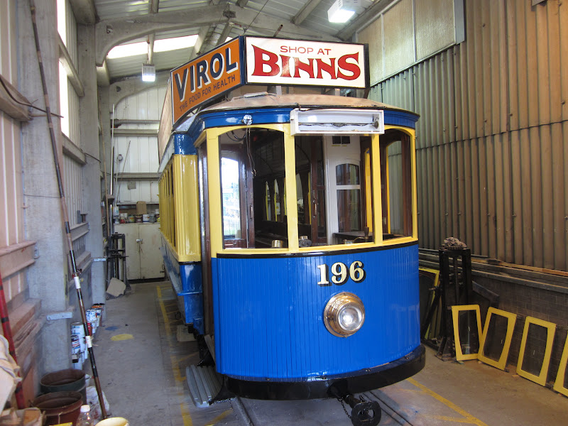 As if this was not exciting enough, work is also fast approaching completion on the overhaul of Oporto 196 which has been treated to a stunning repaint in South Shields blue and primrose livery. Varnishing work was carried out over the past weekend and roof advert boards similar to those just recently removed from car 10 have been fitted, featuring the ‘Shop at Binns’ slogan famously carried by many North East trams. Some finishing touches remain to be completed – most notably refitting of all saloon glazing – but this should also be completed before August 30th to enable 196 to play a major role in the four-day event.