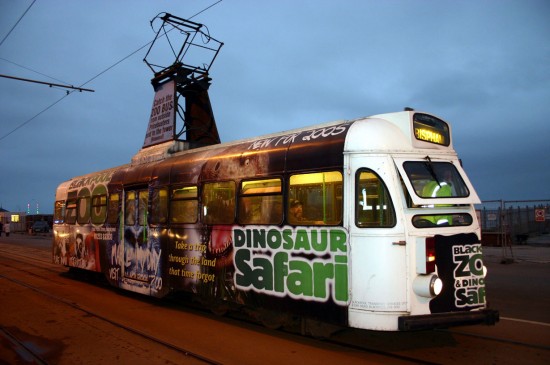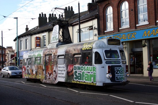 This advert – which lets be honest probably wasn’t a patch of some of the earlier Blackpool Zoo designs since the first in 1975 – was first applied on 626 (one of the Brush Railcoaches which underwent overhauls in the 1990s) in mid-2005 and lasted until the end of the 2008 season. Featuring a white base the tram’s advertising vinyls included the use of the dreaded contravision including images of various animals you could see at the Zoo including Tigers, Lions… and Dinosaurs!